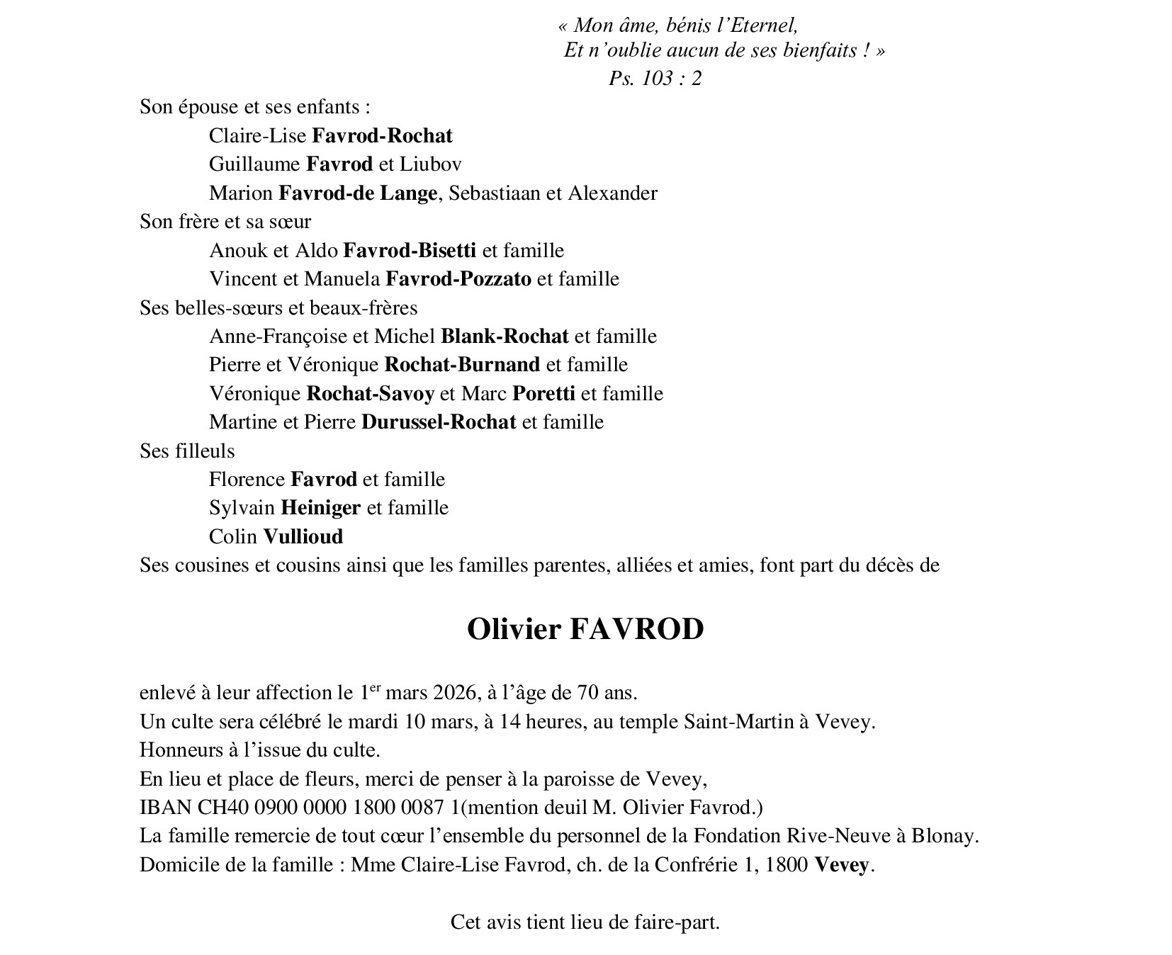 Monsieur Olivier FAVROD 15 sep. 1955 - 01 mar. 2026 Avis mortuaire PFG Partager sur: Galerie PreviousNext PreviousNext