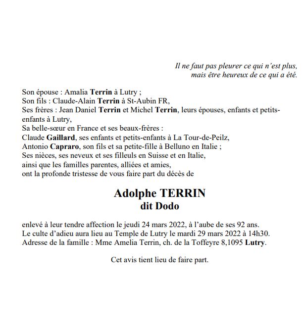 Adolphe TERRIN 07 mai. 1930 - 24 mar. 2022 Avis mortuaire PFG Télecharger PDF Partager sur: Galerie PreviousNext PreviousNext
