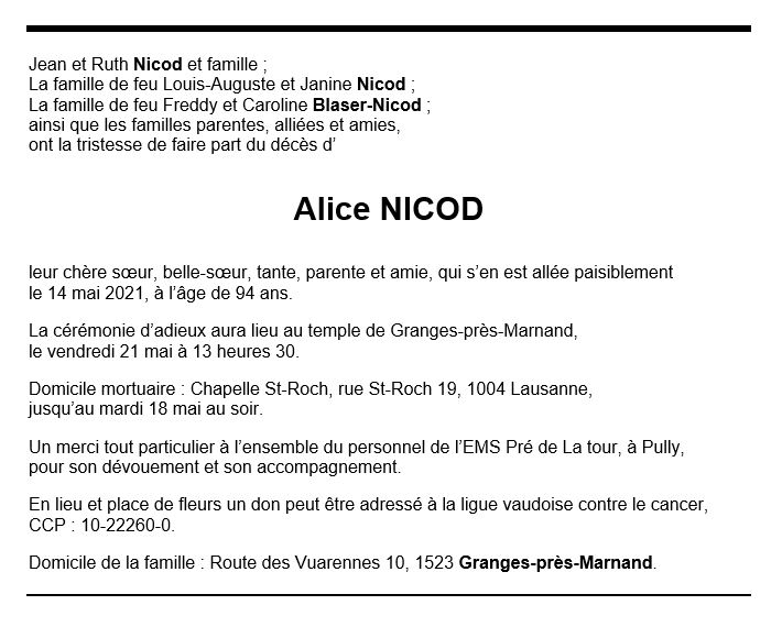 Alice NICOD 11 avr. 1927 - 14 mai. 2021 Avis mortuaire PFG Télecharger PDF Partager sur: Galerie PreviousNext PreviousNext