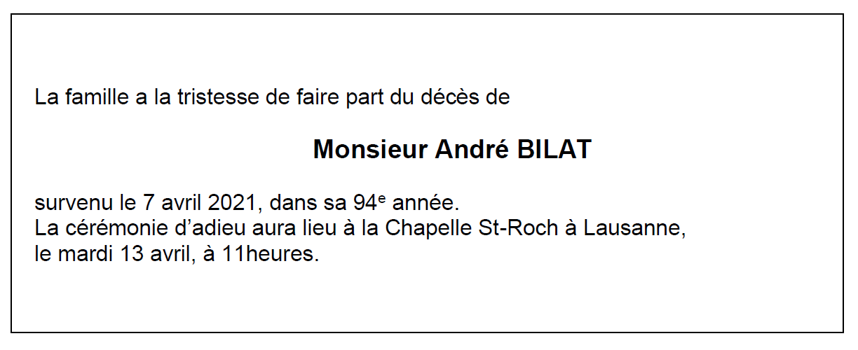 André BILAT 22 sep. 1927 - 07 avr. 2021 Avis mortuaire PFG Télecharger PDF Partager sur: Galerie PreviousNext PreviousNext