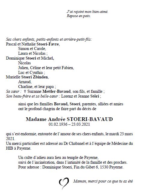 Andrée STOERI-BAVAUD 01 fév. 1936 - 23 mar. 2021 Avis mortuaire PFG Télecharger PDF Partager sur: Galerie PreviousNext PreviousNext