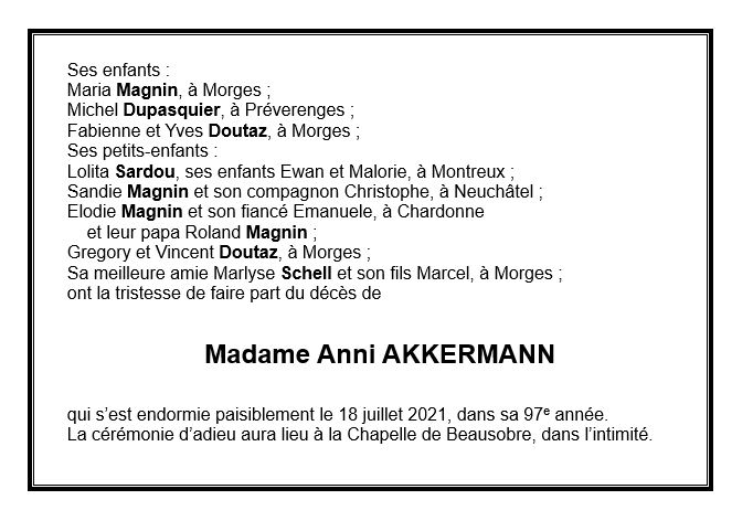 Anni AKKERMANN 15 mar. 1925 - 18 juil. 2021 Avis mortuaire PFG Télecharger PDF Partager sur: Galerie PreviousNext PreviousNext