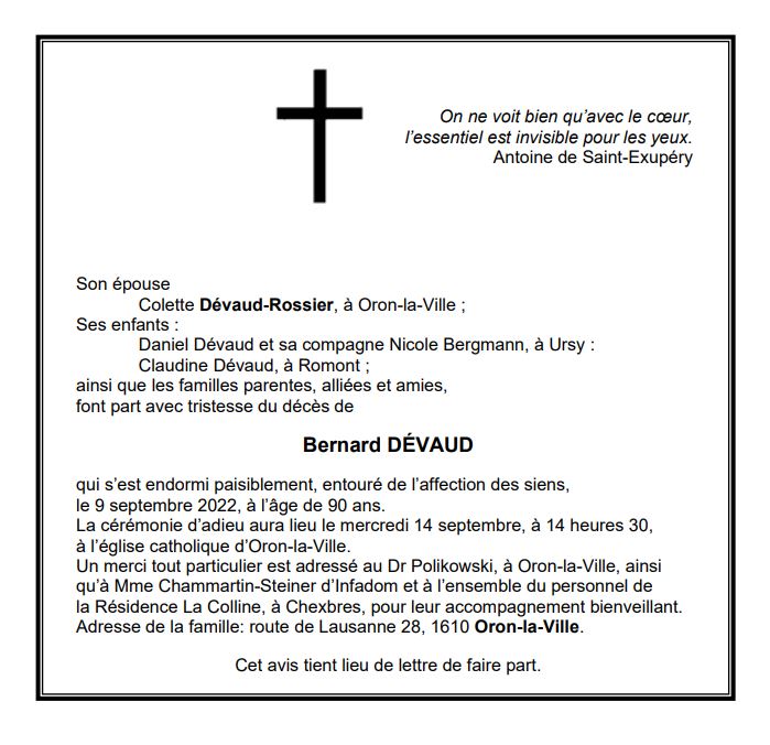 Bernard DÉVAUD 17 mai. 1932 - 09 sep. 2022 Avis mortuaire PFG Télecharger PDF Partager sur: Galerie PreviousNext PreviousNext