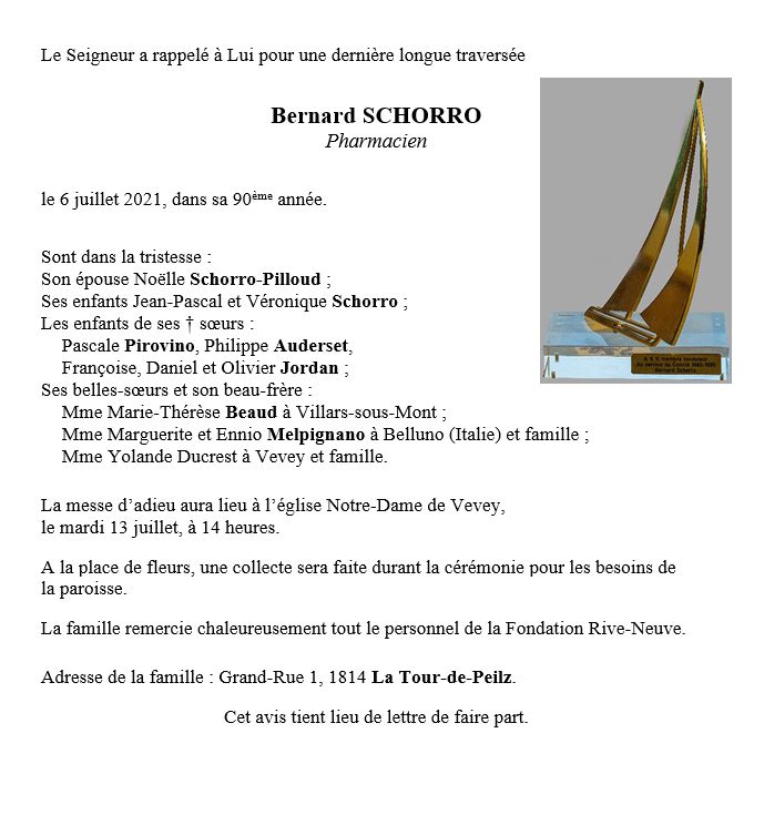 Bernard SCHORRO 18 fév. 1932 - 06 juil. 2021 Avis mortuaire PFG Télecharger PDF Partager sur: Galerie PreviousNext PreviousNext