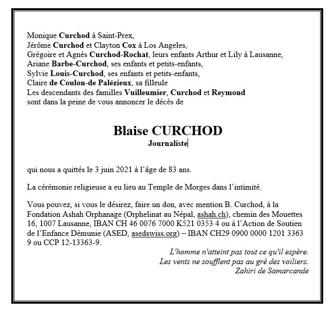 Blaise CURCHOD 07 jan. 1938 - 03 juin. 2021 Avis mortuaire PFG Télecharger PDF Partager sur: Galerie PreviousNext PreviousNext