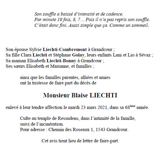 Blaise LIECHTI 25 déc. 1953 - 23 mar. 2021 Avis mortuaire PFG Télecharger PDF Partager sur: Galerie PreviousNext PreviousNext