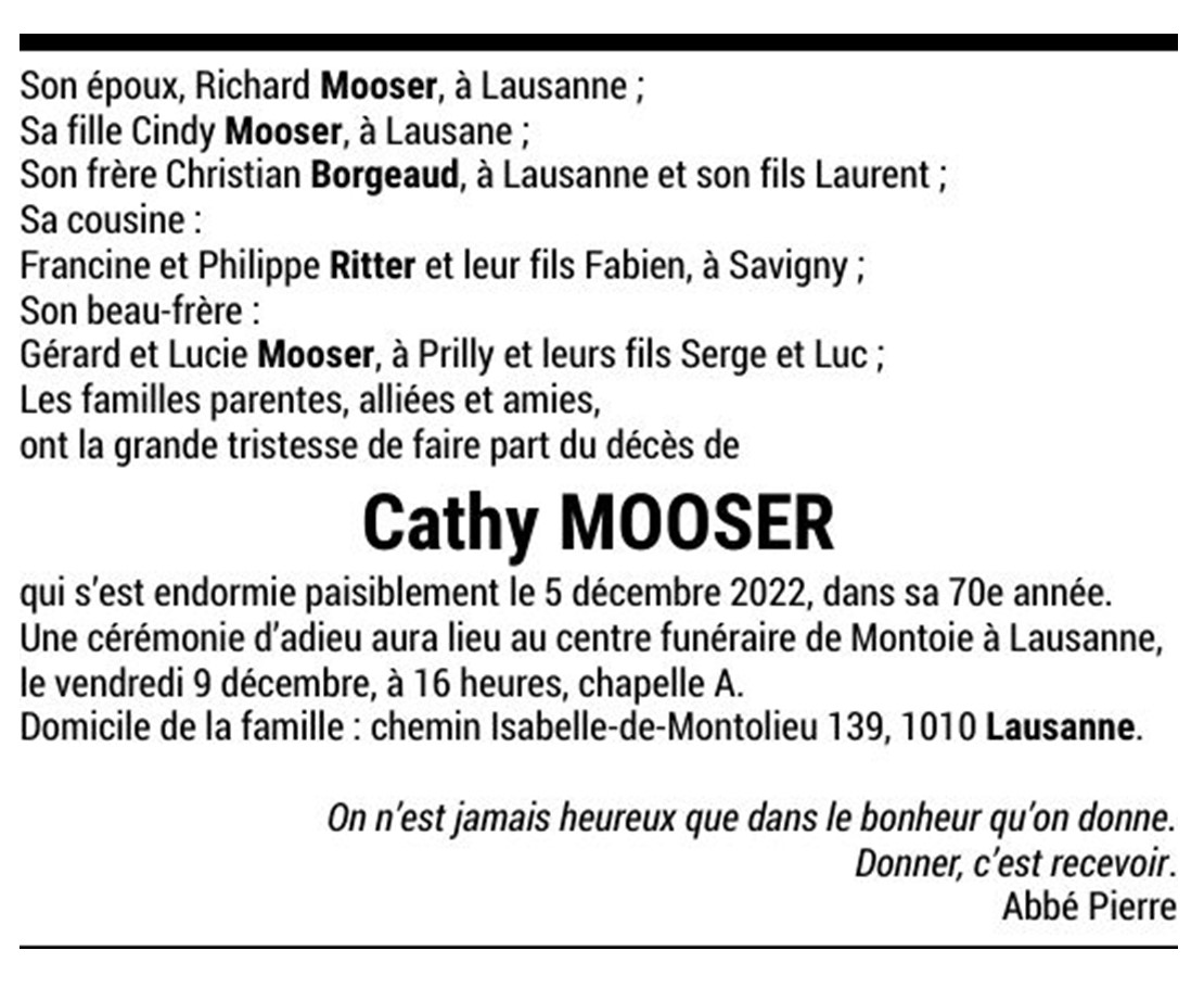Cathy MOOSER 09 juin. 1953 - 05 déc. 2022 Avis mortuaire PFG Télecharger PDF Partager sur: Galerie PreviousNext PreviousNext