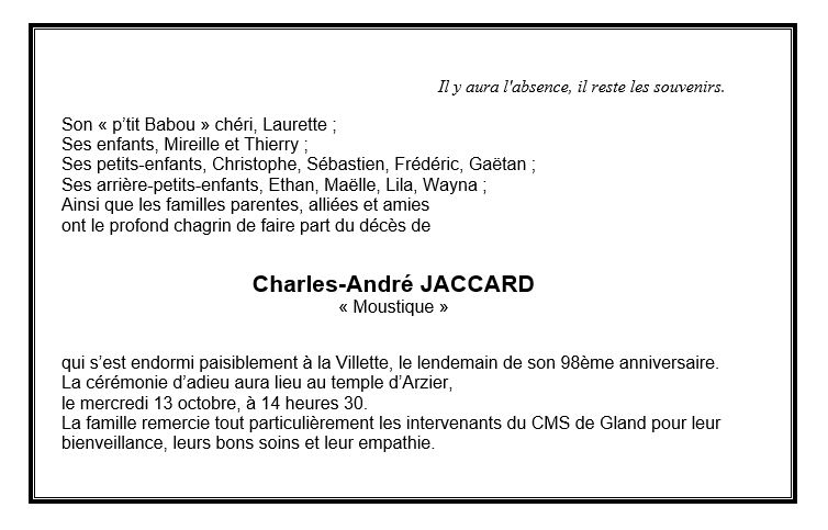 Charles-André JACCARD 05 oct. 1923 - 07 oct. 2021 Avis mortuaire PFG Télecharger PDF Partager sur: Galerie PreviousNext PreviousNext