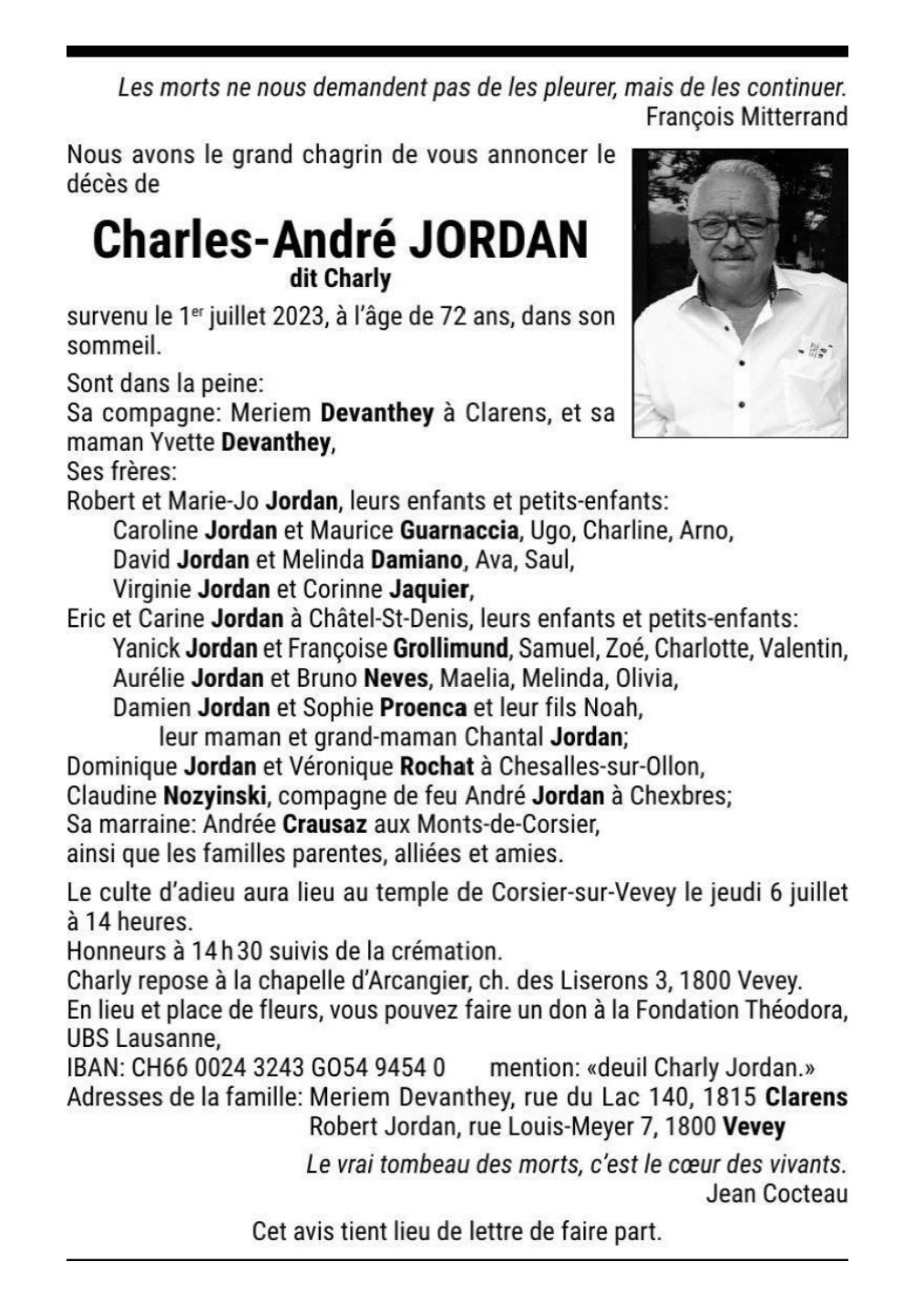 Charles-André JORDAN dit Charly 24 jan. 1951 - 01 juil. 2023 Avis mortuaire PFG Télecharger PDF Partager sur: Galerie PreviousNext PreviousNext