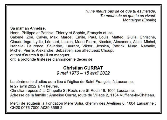 Christian CURRAT 09 mai. 1970 - 15 avr. 2022 Avis mortuaire PFG Télecharger PDF Partager sur: Galerie PreviousNext PreviousNext