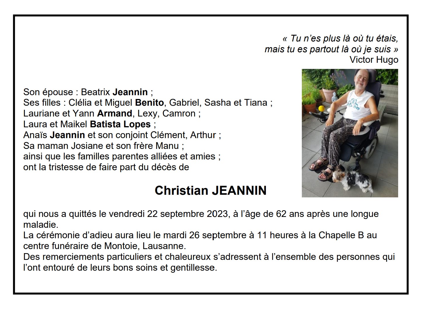 Christian JEANNIN 11 aoû. 1961 - 22 sep. 2023 Avis mortuaire PFG Télecharger PDF Partager sur: Galerie PreviousNext PreviousNext