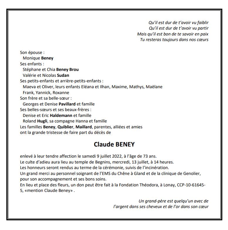 Claude BENEY 28 avr. 1949 - 09 juil. 2022 Avis mortuaire PFG Télecharger PDF Partager sur: Galerie PreviousNext PreviousNext