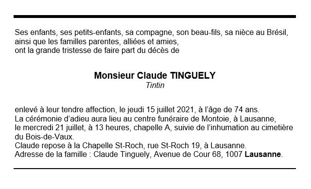 Claude TINGUELY 11 juil. 1947 - 15 juil. 2021 Avis mortuaire PFG Télecharger PDF Partager sur: Galerie PreviousNext PreviousNext