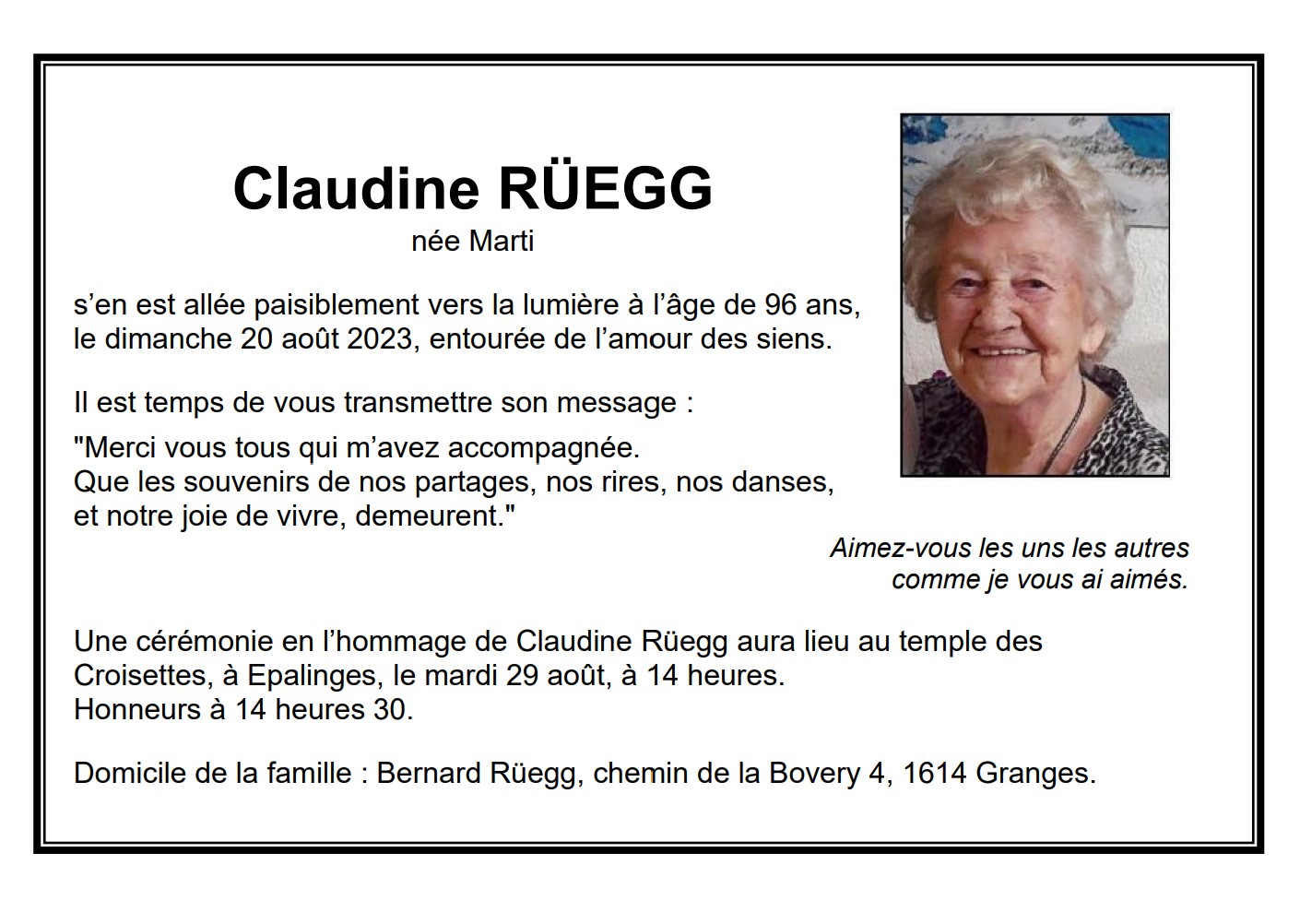 Claudine RÜEGG 18 juil. 1927 - 20 aoû. 2023 Avis mortuaire PFG Télecharger PDF Partager sur: Galerie PreviousNext PreviousNext
