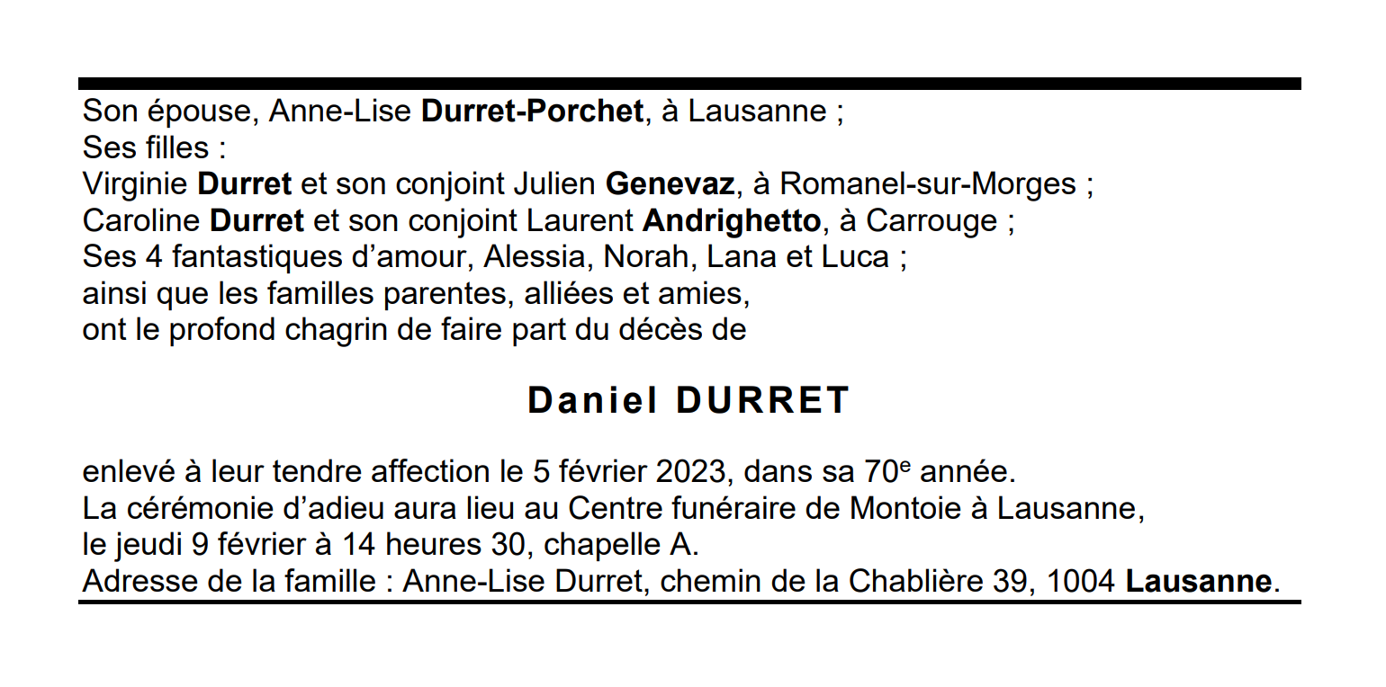 Daniel DURRET 02 mar. 1953 - 05 fév. 2023 Avis mortuaire PFG Télecharger PDF Partager sur: Galerie PreviousNext PreviousNext