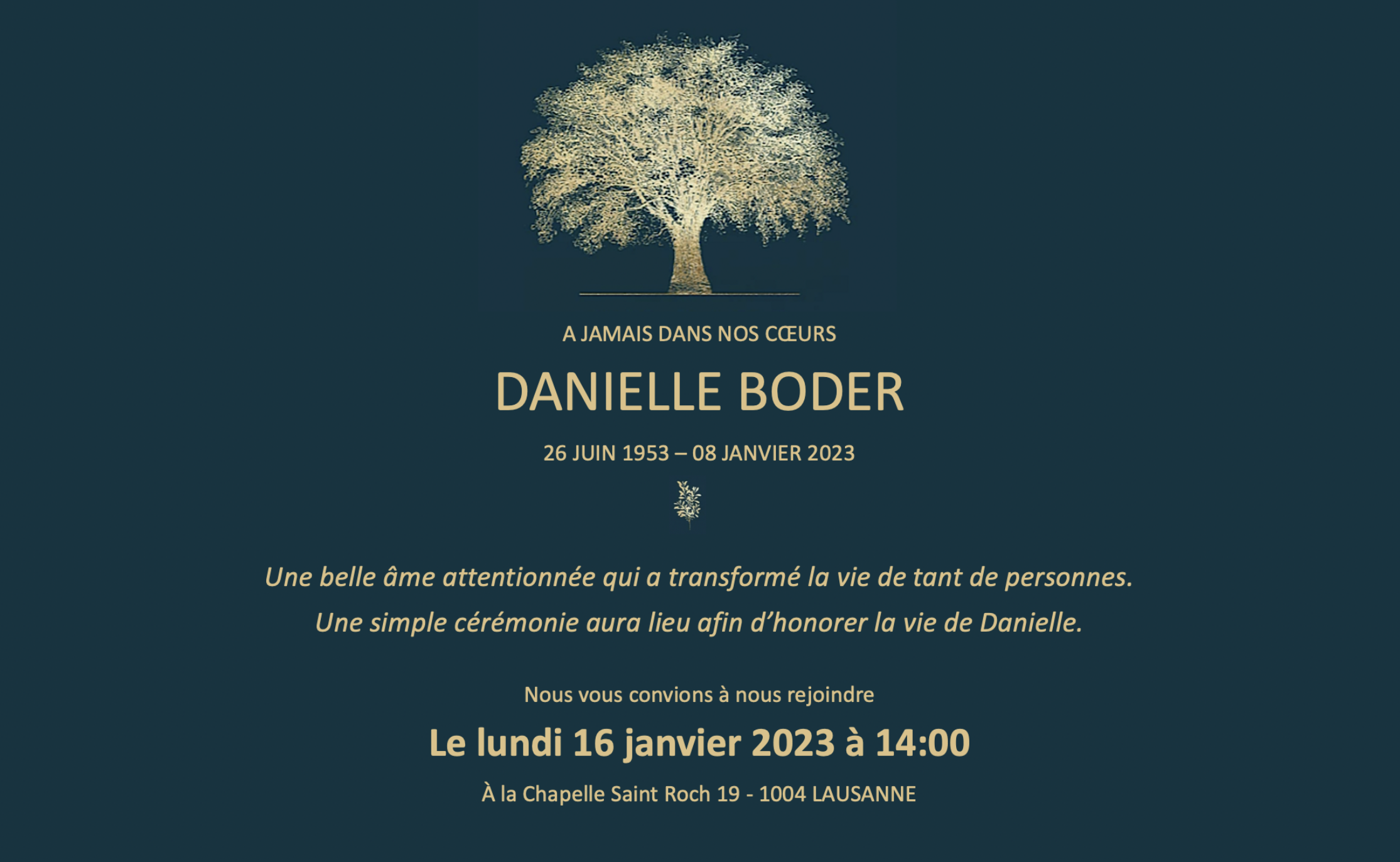 Danielle Boder 26 juin. 1953 - 08 jan. 2023 Avis mortuaire PFG Télecharger PDF Partager sur: Galerie PreviousNext PreviousNext
