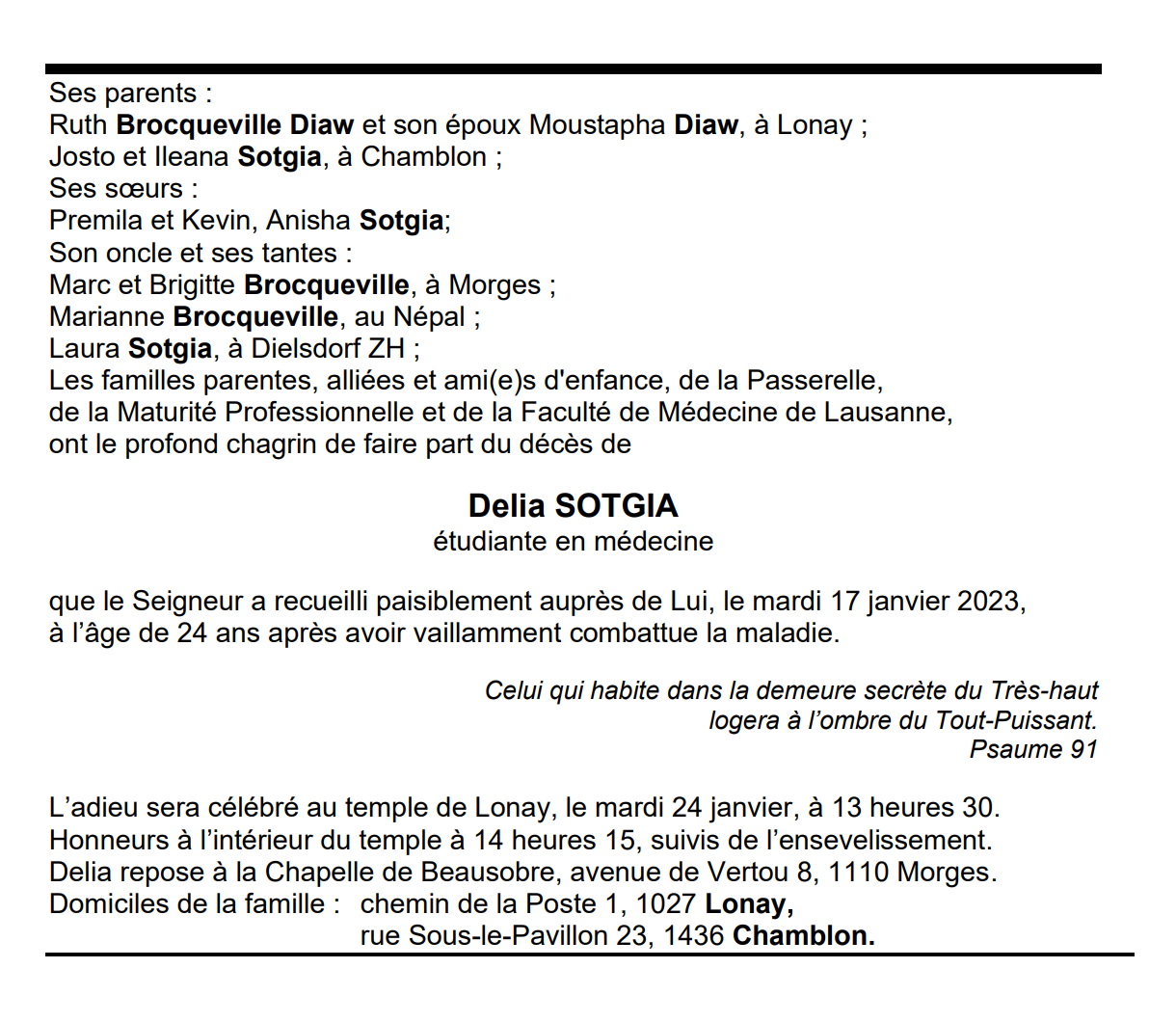 Delia SOTGIA 09 jan. 1999 - 17 jan. 2023 Avis mortuaire PFG Télecharger PDF Partager sur: Galerie PreviousNext PreviousNext