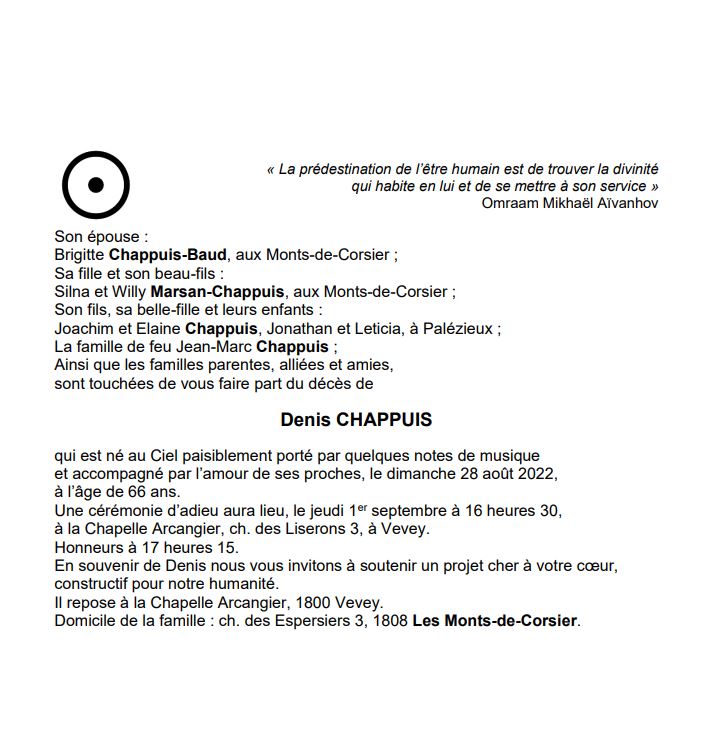 Denis CHAPPUIS 11 mai. 1956 - 28 aoû. 2022 Avis mortuaire PFG Télecharger PDF Partager sur: Galerie PreviousNext PreviousNext