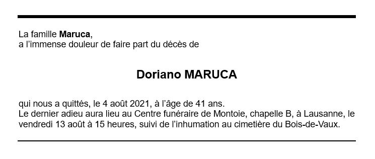 Doriano MARUCA 08 mai. 1980 - 04 aoû. 2021 Avis mortuaire PFG Télecharger PDF Partager sur: Galerie PreviousNext PreviousNext
