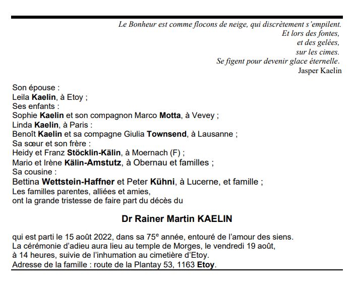 Dr Rainer Martin KAELIN 13 jan. 1948 - 15 aoû. 2022 Avis mortuaire PFG Télecharger PDF Partager sur: Galerie PreviousNext PreviousNext