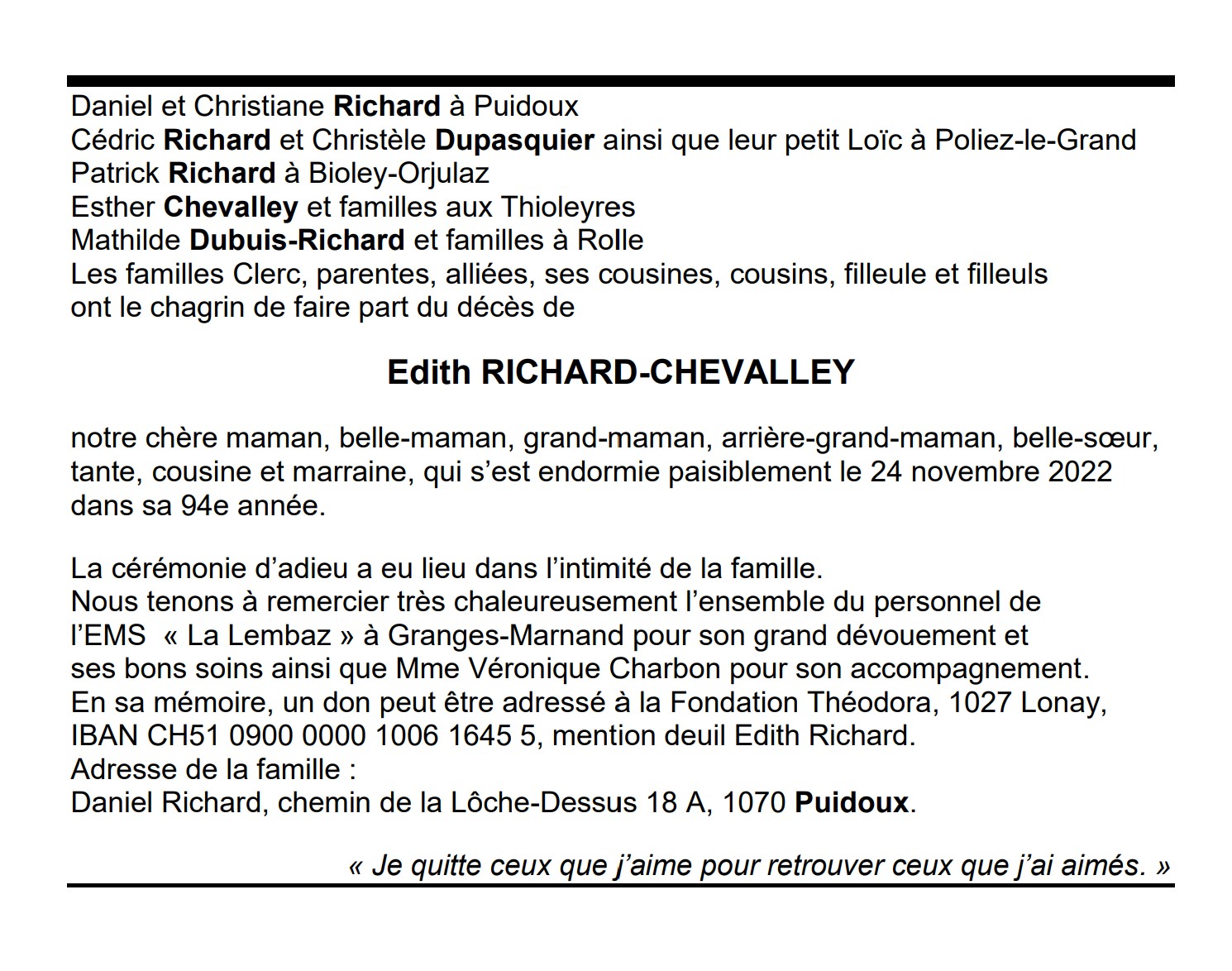 Edith RICHARD-CHEVALLEY 24 avr. 1929 - 24 nov. 2022 Avis mortuaire PFG Télecharger PDF Partager sur: Galerie PreviousNext PreviousNext