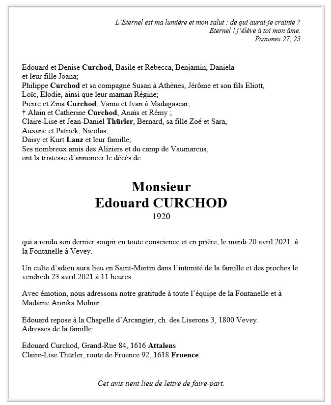 Edouard CURCHOD 24 avr. 1920 - 20 avr. 2021 Avis mortuaire PFG Télecharger PDF Partager sur: Galerie PreviousNext PreviousNext