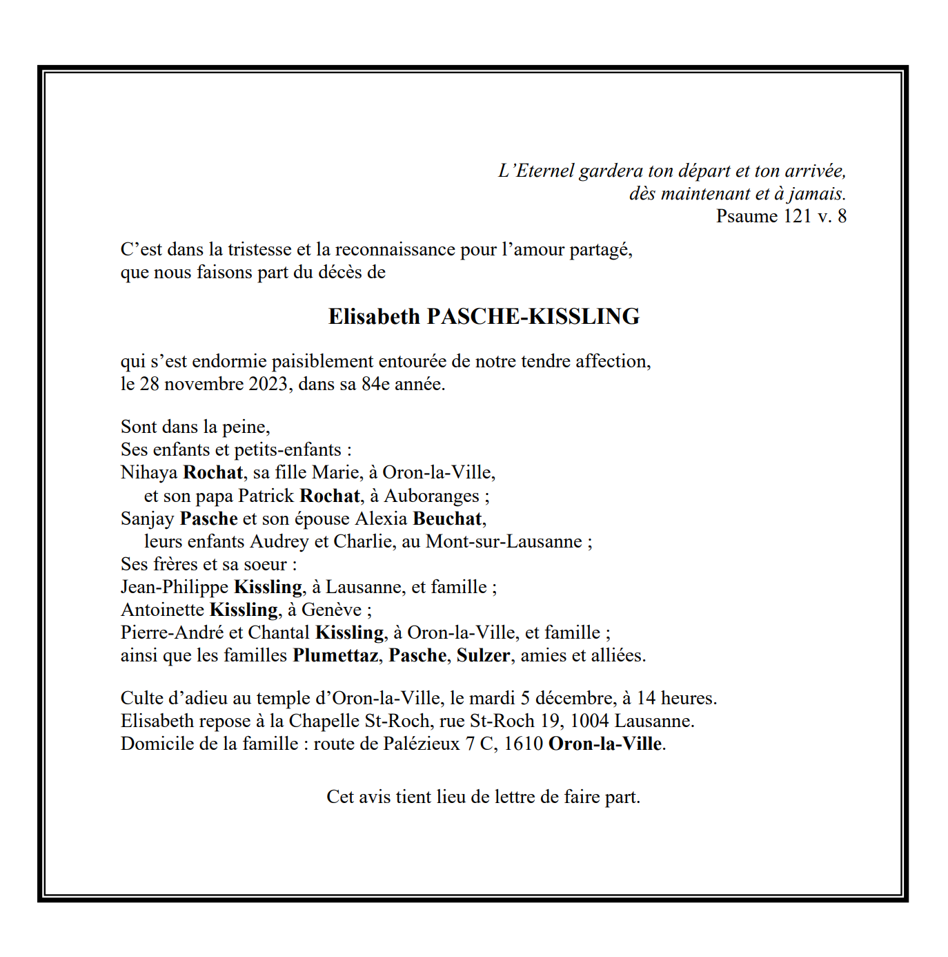Elisabeth PASCHE-KISSLING 21 sep. 1940 - 28 nov. 2023 Avis mortuaire PFG Télecharger PDF Partager sur: Galerie PreviousNext PreviousNext