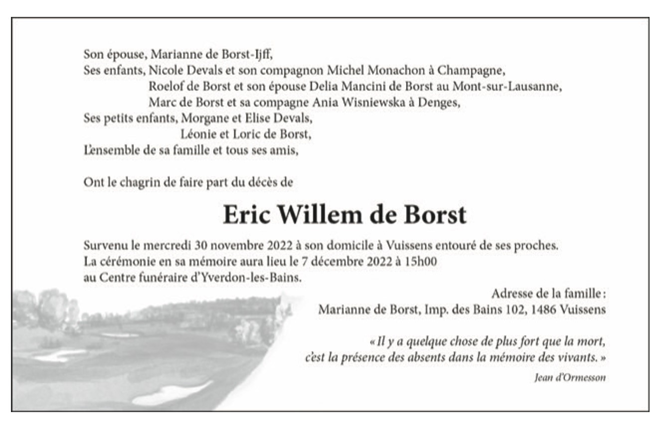 Eric Willem de Borst 07 nov. 1950 - 30 nov. 2022 Avis mortuaire PFG Télecharger PDF Partager sur: Galerie PreviousNext PreviousNext