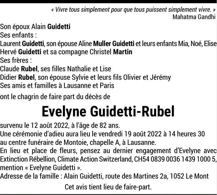 Evelyne Guidetti-Rubel 29 déc. 1939 - 12 aoû. 2022 Avis mortuaire PFG Télecharger PDF Partager sur: Galerie PreviousNext PreviousNext