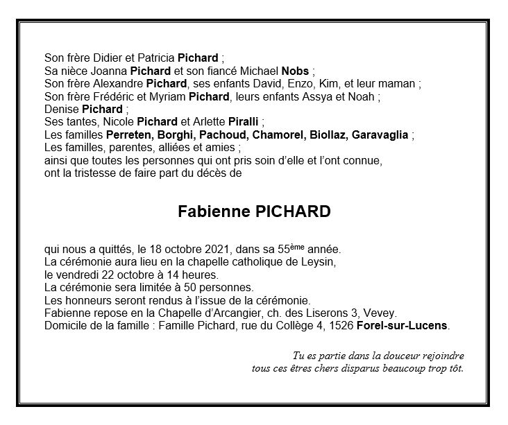 Fabienne PICHARD 07 nov. 1966 - 18 oct. 2021 Avis mortuaire PFG Télecharger PDF Partager sur: Galerie PreviousNext PreviousNext