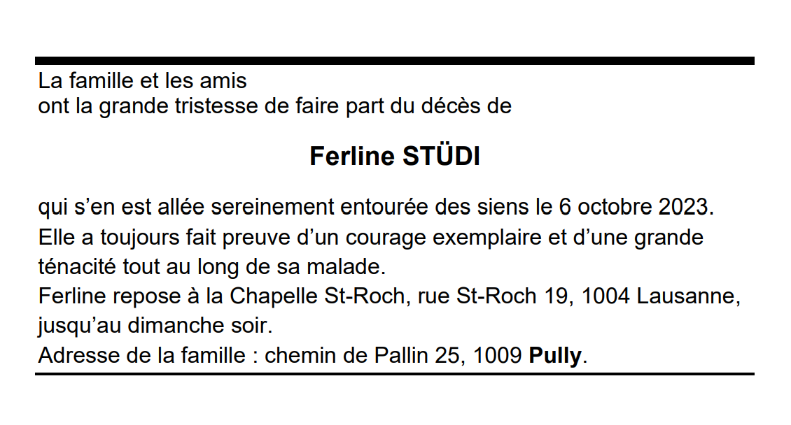 Ferline STÜDI 17 juin. 1949 - 06 oct. 2023 Avis mortuaire PFG Télecharger PDF Partager sur: Galerie PreviousNext PreviousNext