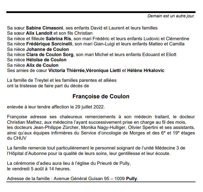 Françoise de Coulon 01 fév. 1951 - 29 juil. 2022 Avis mortuaire PFG Télecharger PDF Partager sur: Galerie PreviousNext PreviousNext