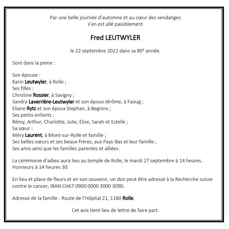 Fred LEUTWYLER 07 avr. 1943 - 22 sep. 2022 Avis mortuaire PFG Télecharger PDF Partager sur: Galerie PreviousNext PreviousNext