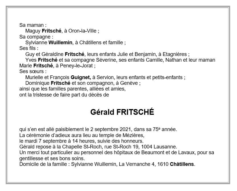 Gérald FRITSCHÉ 09 nov. 1946 - 02 sep. 2021 Avis mortuaire PFG Télecharger PDF Partager sur: Galerie PreviousNext PreviousNext