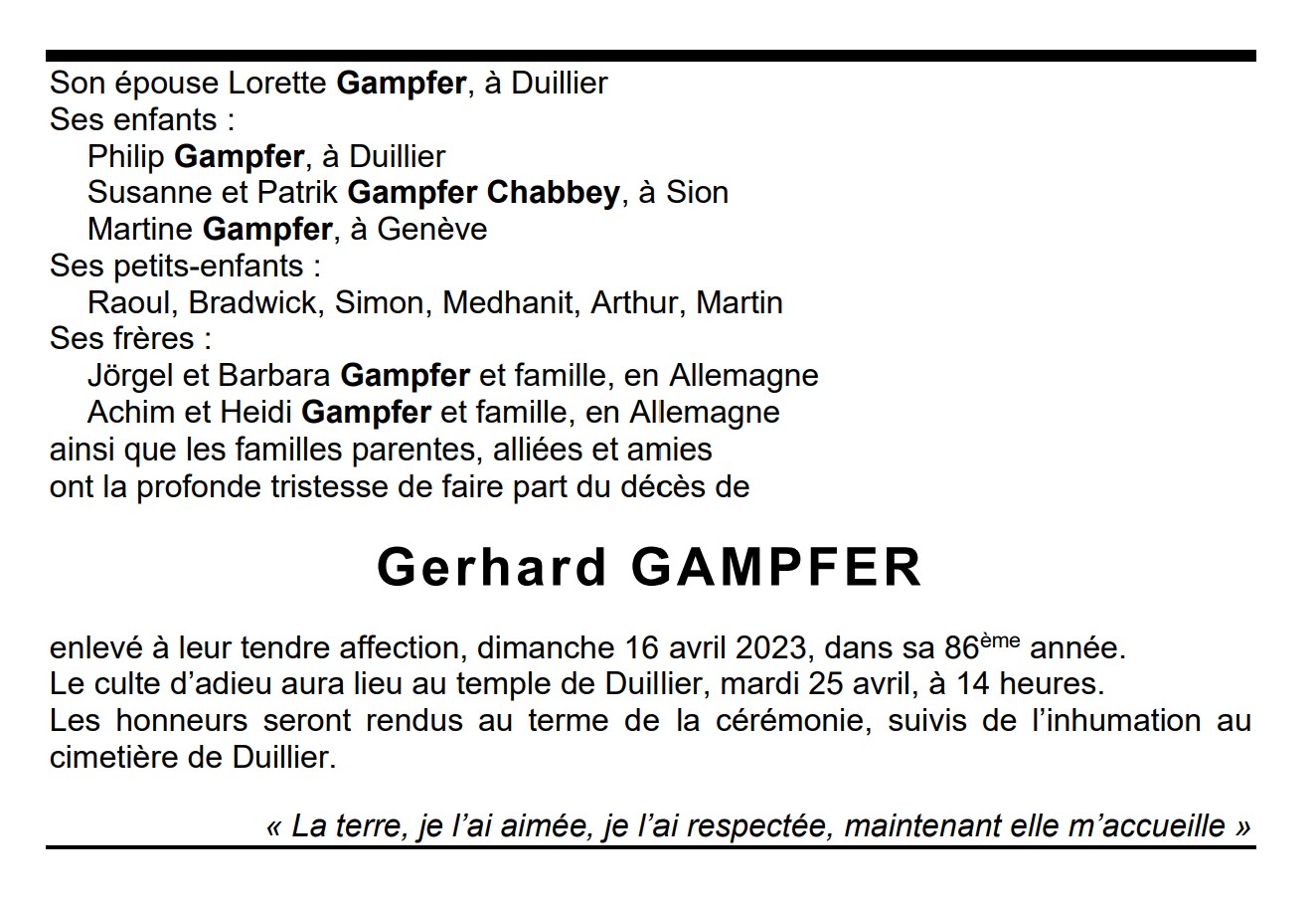 Gerhard GAMPFER 23 juin. 1937 - 16 avr. 2023 Avis mortuaire PFG Télecharger PDF Partager sur: Galerie PreviousNext PreviousNext