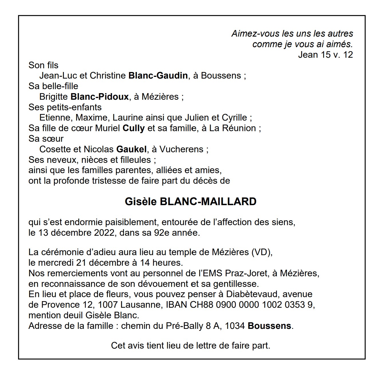 Gisèle BLANC-MAILLARD 12 nov. 1931 - 13 déc. 2022 Avis mortuaire PFG Télecharger PDF Partager sur: Galerie PreviousNext PreviousNext