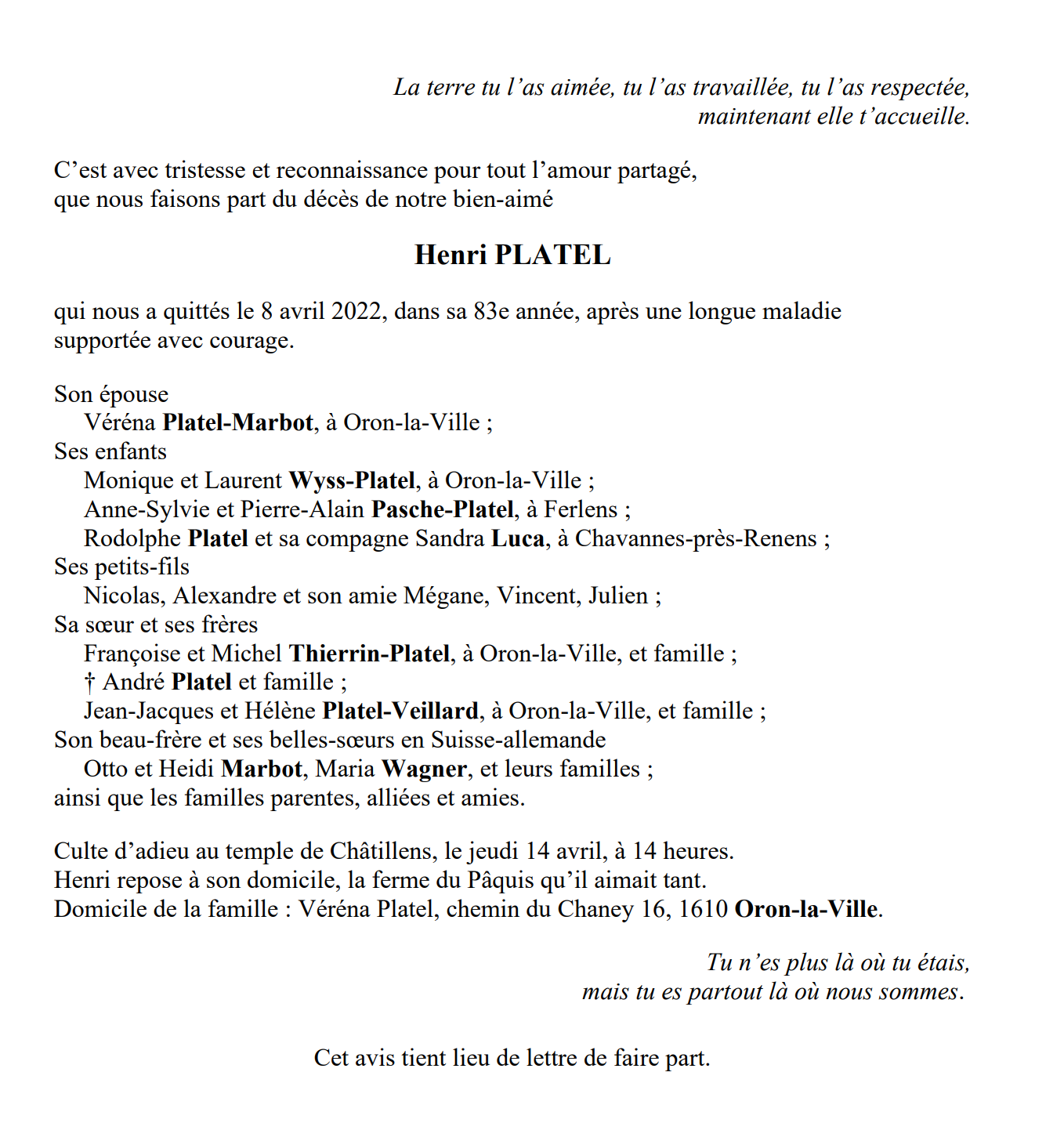 Henri PLATEL 07 juil. 1939 - 08 avr. 2022 Avis mortuaire PFG Télecharger PDF Partager sur: Galerie PreviousNext PreviousNext