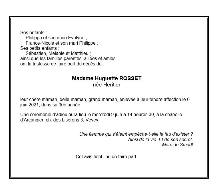 Huguette ROSSET 29 mar. 1932 - 06 juin. 2021 Avis mortuaire PFG Télecharger PDF Partager sur: Galerie PreviousNext PreviousNext