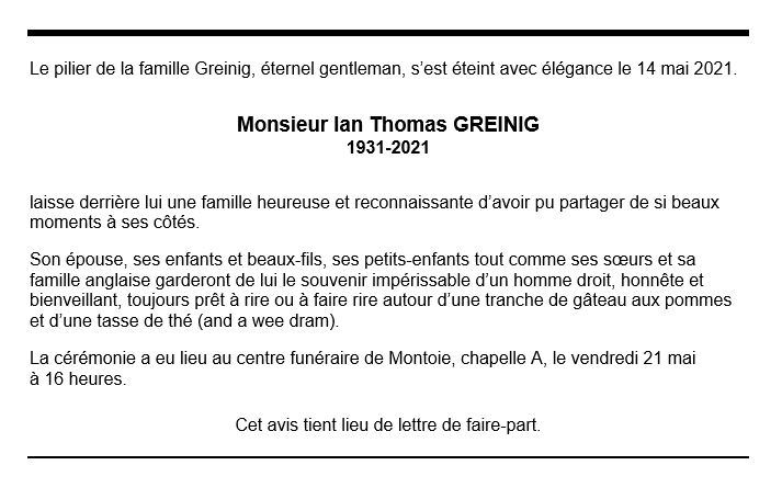 Ian Thomas GREINIG 14 aoû. 1931 - 14 mai. 2021 Avis mortuaire PFG Télecharger PDF Partager sur: Galerie PreviousNext PreviousNext