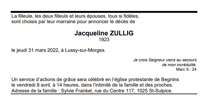 Jacqueline ZULLIG 14 fév. 1923 - 31 mar. 2022 Avis mortuaire PFG Télecharger PDF Partager sur: Galerie PreviousNext PreviousNext