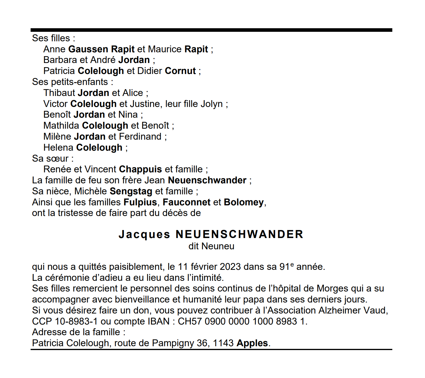 Jacques NEUENSCHWANDER 26 aoû. 1932 - 11 fév. 2023 Avis mortuaire PFG Télecharger PDF Partager sur: Galerie PreviousNext PreviousNext