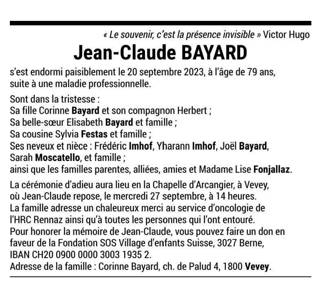 Jean-Claude BAYARD 24 avr. 1944 - 20 sep. 2023 Avis mortuaire PFG Télecharger PDF Partager sur: Galerie PreviousNext PreviousNext