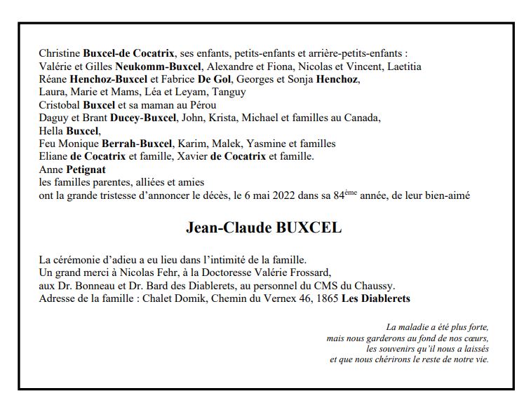 Jean-Claude BUXCEL 13 nov. 1938 - 06 mai. 2022 Avis mortuaire PFG Télecharger PDF Partager sur: Galerie PreviousNext PreviousNext
