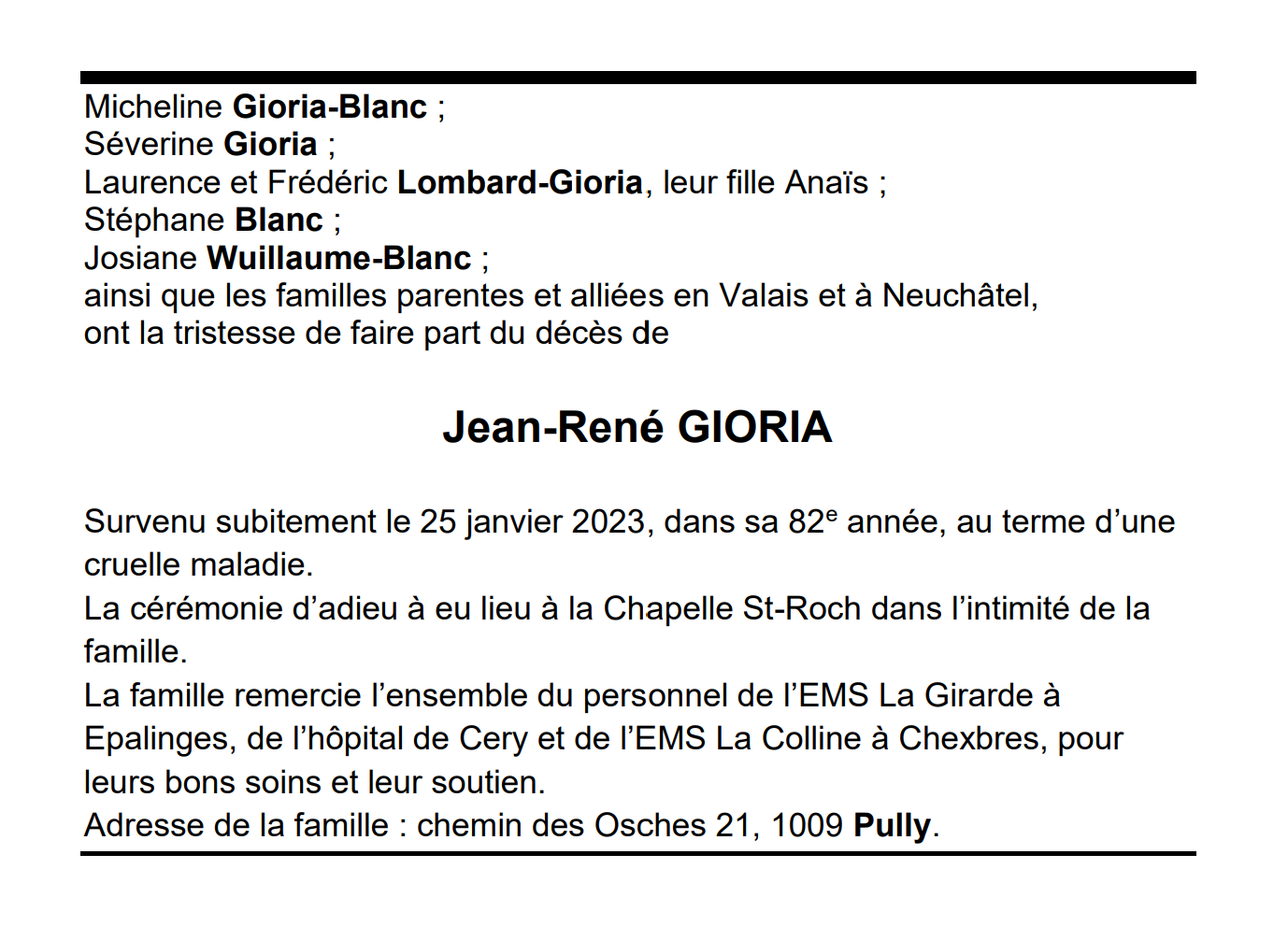 Jean-René GIORIA 14 oct. 1941 - 25 jan. 2023 Avis mortuaire PFG Télecharger PDF Partager sur: Galerie PreviousNext PreviousNext