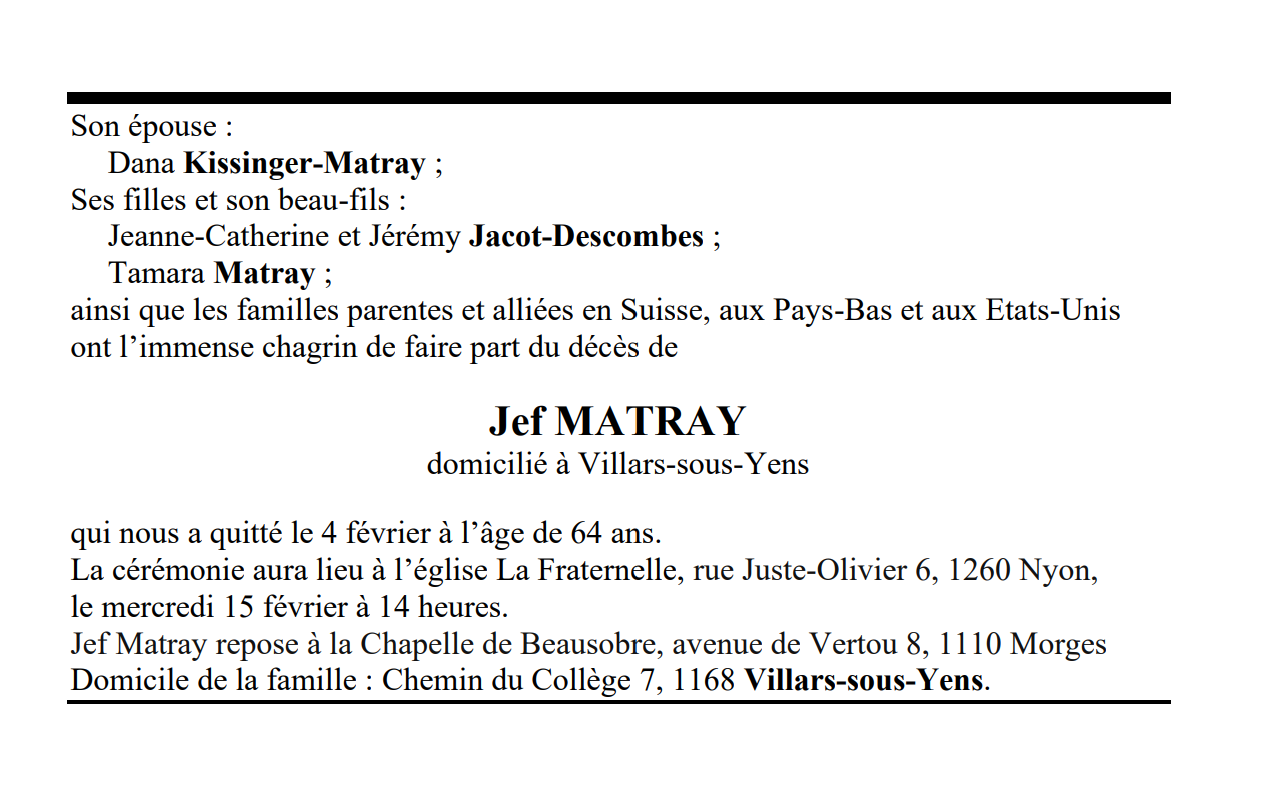 Jef MATRAY 04 avr. 1958 - 04 fév. 2023 Avis mortuaire PFG Télecharger PDF Partager sur: Galerie PreviousNext PreviousNext