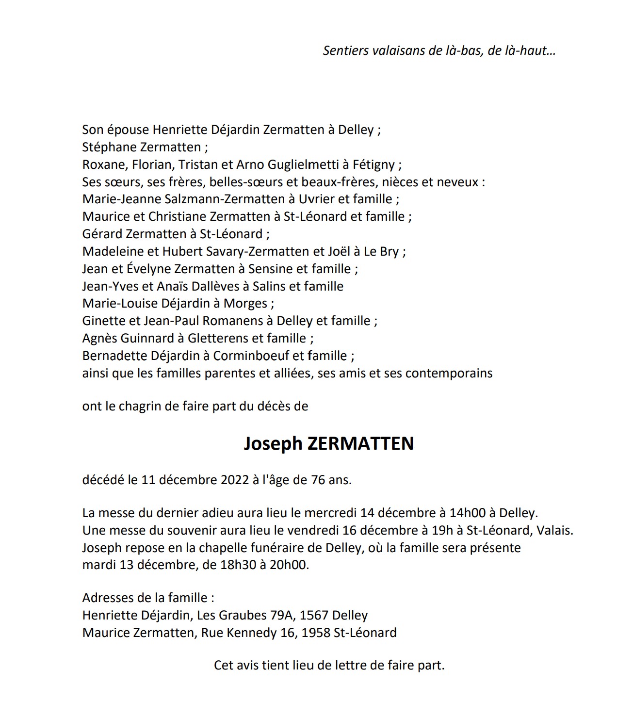 Joseph ZERMATTEN 23 fév. 1946 - 11 déc. 2022 Avis mortuaire PFG Télecharger PDF Partager sur: Galerie PreviousNext PreviousNext