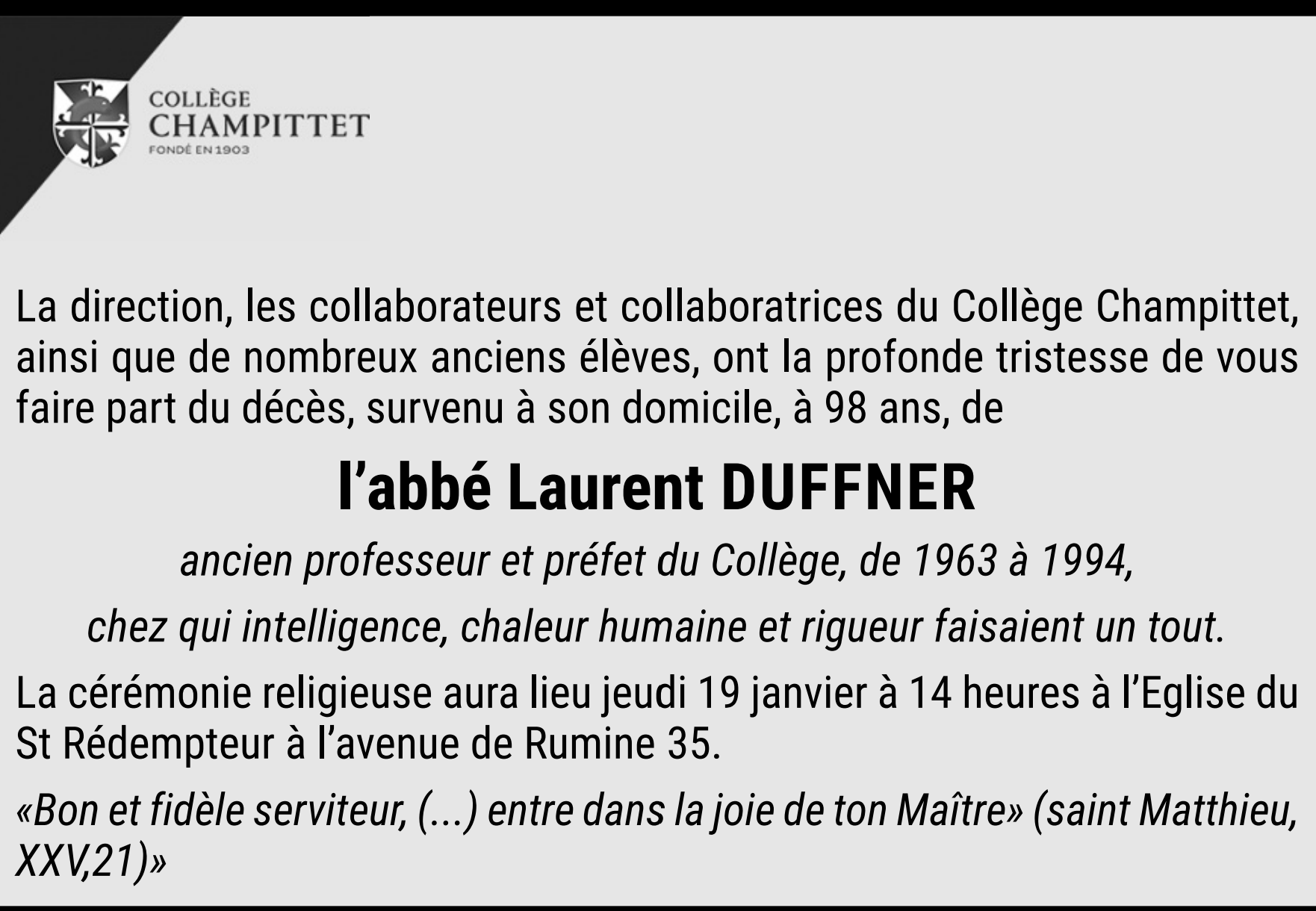 L'abbé Laurent DUFFNER 11 mar. 1924 - 14 jan. 2023 Avis mortuaire PFG Télecharger PDF Partager sur: Galerie PreviousNext PreviousNext