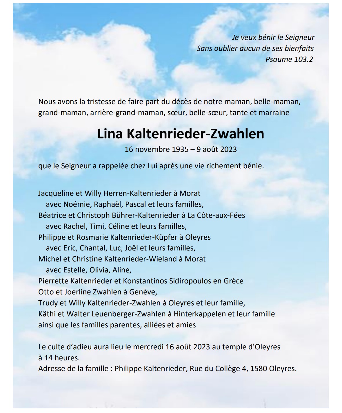Lina Kaltenrieder-Zwahlen 16 nov. 1935 - 09 aoû. 2023 Avis mortuaire PFG Télecharger PDF Partager sur: Galerie