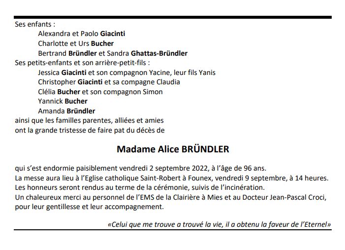 Madame Alice BRÜNDLER 27 aoû. 1926 - 02 sep. 2022 Avis mortuaire PFG Télecharger PDF Partager sur: Galerie PreviousNext PreviousNext