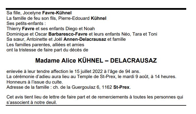 Madame Alice KÜHNEL – DELACRAUSAZ 11 juil. 1928 - 15 juil. 2022 Avis mortuaire PFG Télecharger PDF Partager sur: Galerie PreviousNext PreviousNext